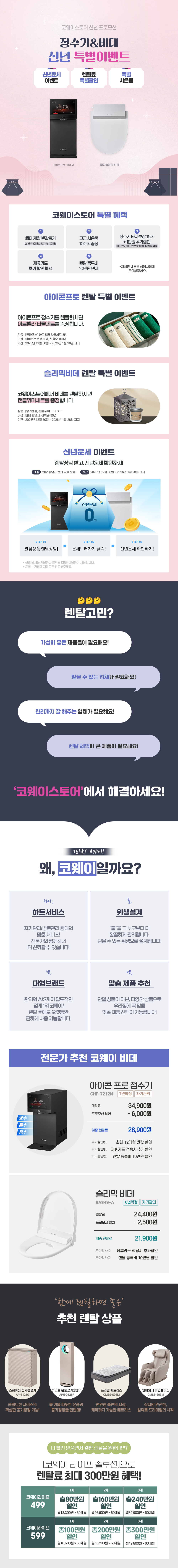 - 1. 2대 이상 구매 시 특약은 정수기, 비데, 청정기 등 회사가 정하는 모델을 대상으로 렌탈 또는 매매를 혼합하여 2대 이상 구성 시 적용됩니다.